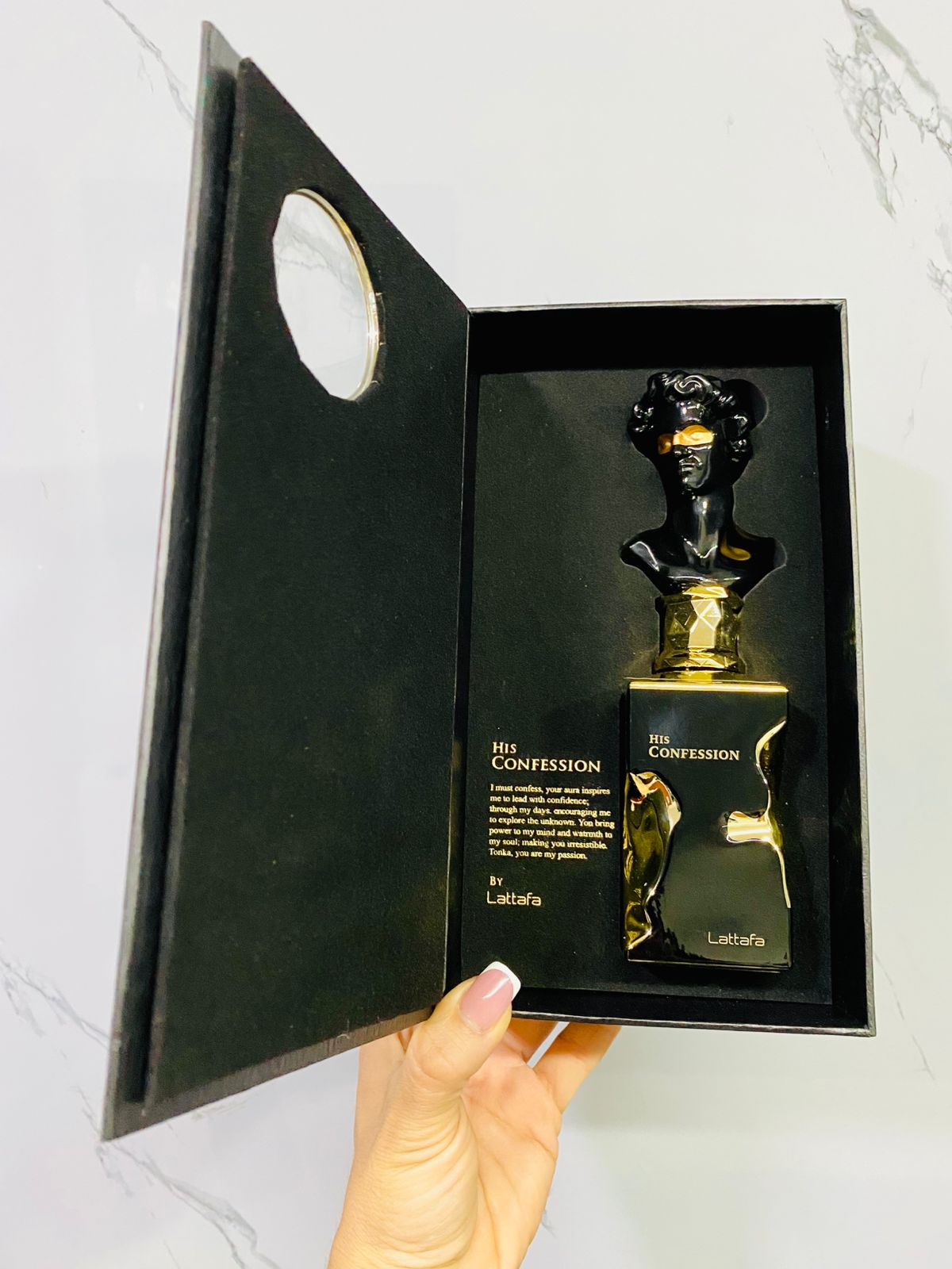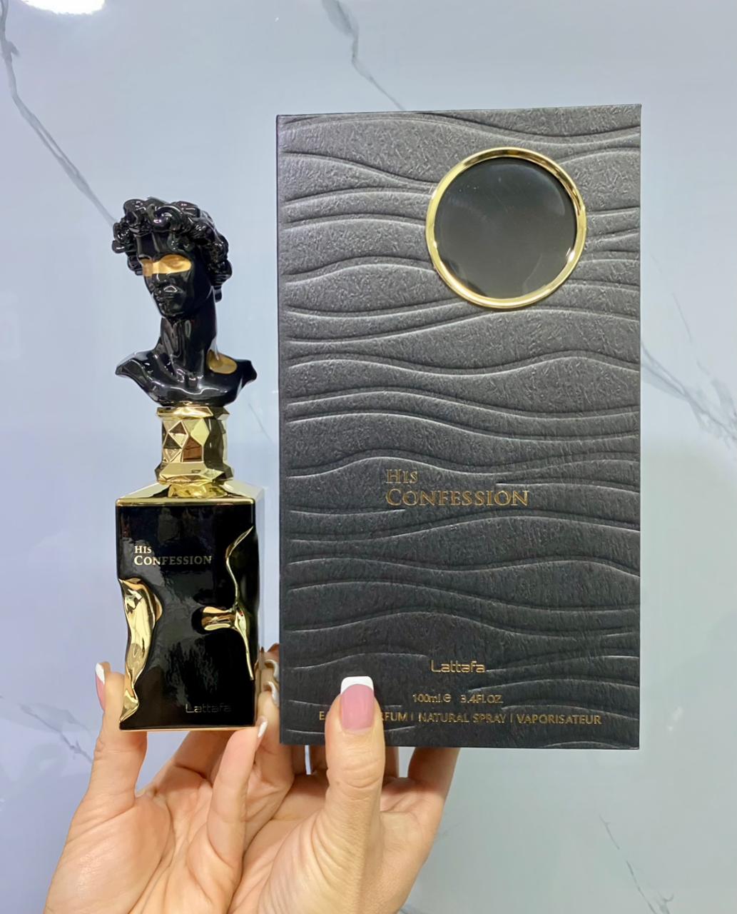 His Confession de Lattafa Perfumes es una fragancia de la familia olfativa Oriental Amaderada para Hombres. Esta fragrancia es nueva. His Confession se lanzó en 2024. Las Notas de Salida son canela, lavanda y mandarina; las Notas de Corazón son iris, benjuí, ciprés y Mahonial; las Notas de Fondo son vainilla, haba tonka, ámbar, incienso, cedro y pachulí.