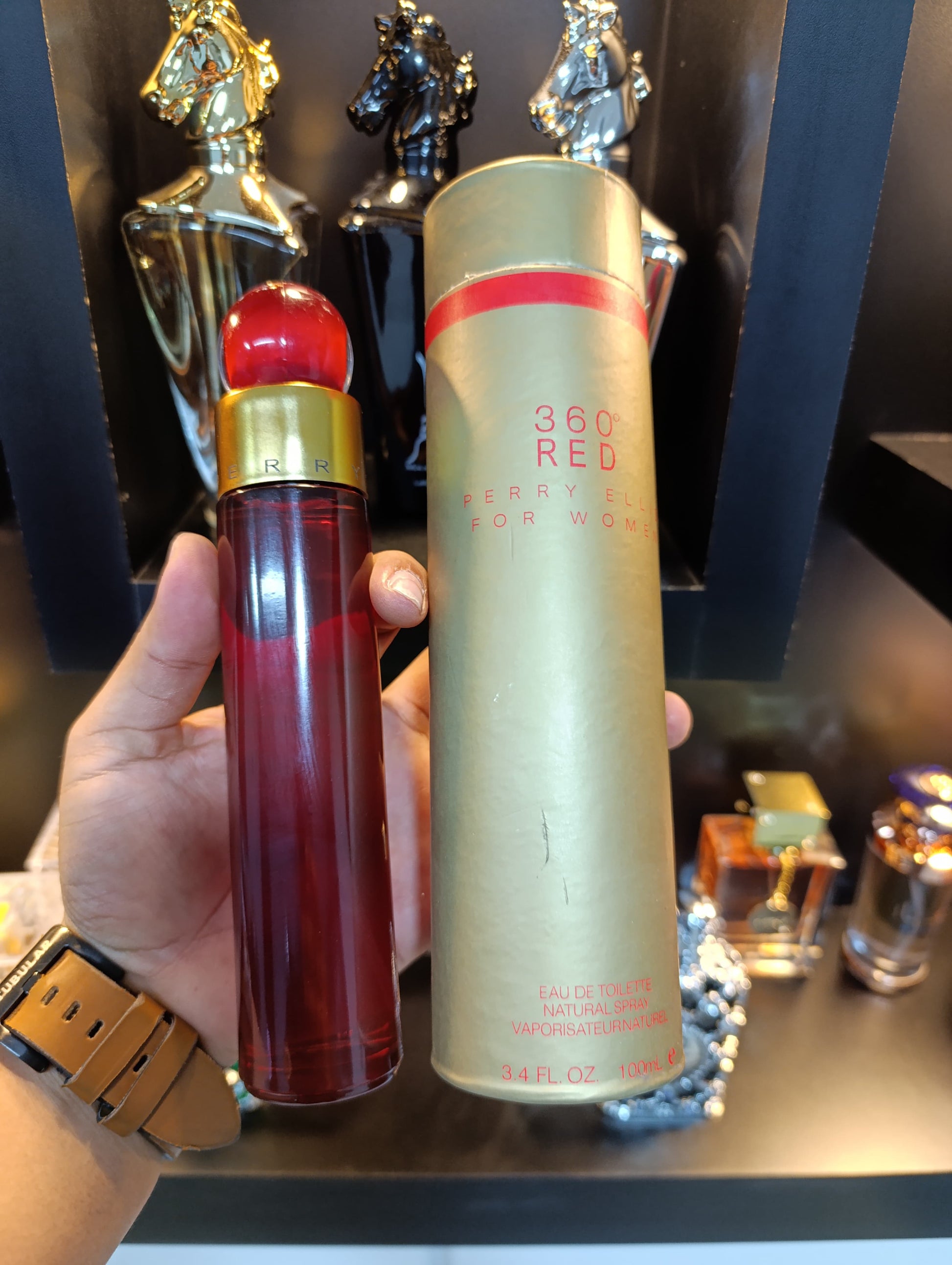 Es una fragancia de la familia olfativa Floral para Mujeres. 360° Red se lanzó en 2003. Las Notas de Salida son ciclamen (violeta persa), hojas de naranja y ciruela; las Notas de Corazón son flor de azahar del naranjo, orquídea, mimosa y jazmín; las Notas de Fondo son ámbar y almizcle.